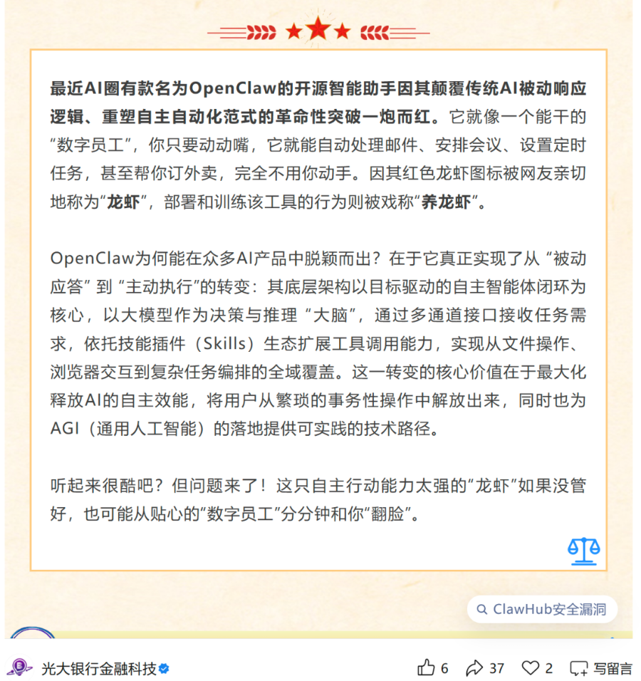 也正因其安全机制不完善、高权限易被滥用等问题,近日,中国光大银行、山东省消费者协会、中国互联网金融协会接连发布专项提示,直指这款AI工具在金融场景应用中暗藏的多重风险,为金融从业机构及广大消费者敲响安全警钟,明确安全使用准则。
