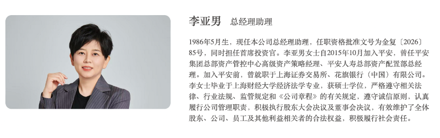 另一位总经理助理李亚男,同时担任平安产险首席投资官。她是一位“80后”,于1986年5月生,毕业于上海财经大学经济法学专业(获硕士学位)。