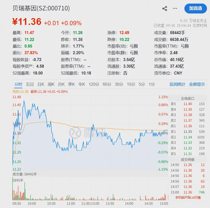 3月16日,震荡调整中的贝瑞基因以11.26元/股(前复权,下同)低开。收盘价11.36元/股,较一年多前的高点下跌超30%,较98元/股的历史高点下跌超88%。