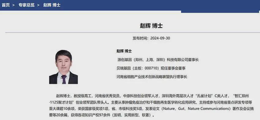 赵辉的商业版图以生物科技为核心,布局清晰且争议交织。作为海归科研人员,赵辉在美国亲历了细胞治疗技术的突破性发展后,于2016年回国创业,在河南郑州创办了源创基因,并曾宣称将国外先进诊疗技术转化为临床应用,搭建细胞治疗产业化桥梁。