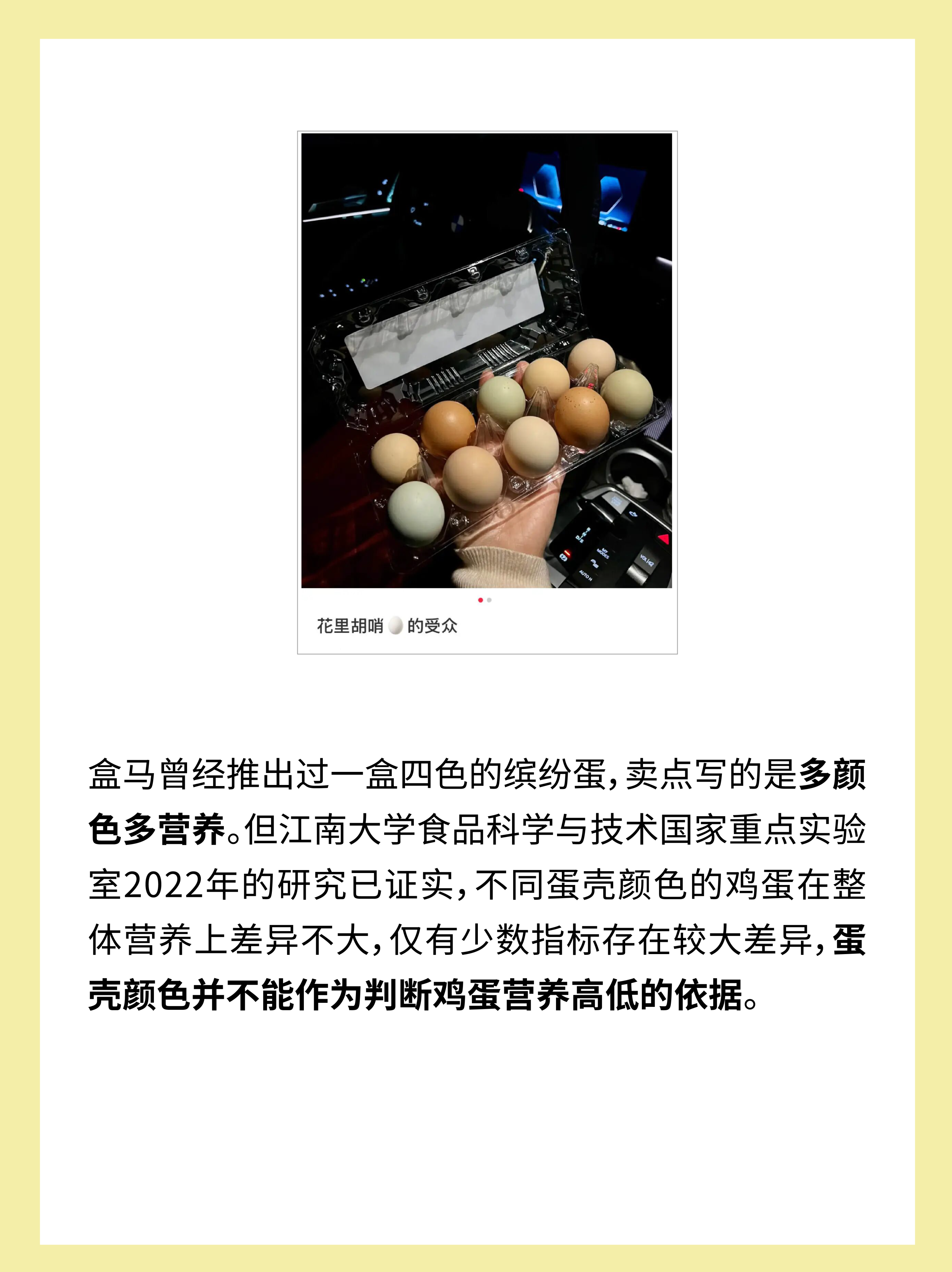 此外还有一种彩色蛋壳的鸡蛋,比如盒马推出过一盒四色的缤纷蛋,卖点写的是多颜色多营养。但江南大学食品科学与技术国家重点实验室2022年的研究已证实,不同蛋壳颜色的鸡蛋在整体营养上差异不大,仅有少数指标存在较大差异。