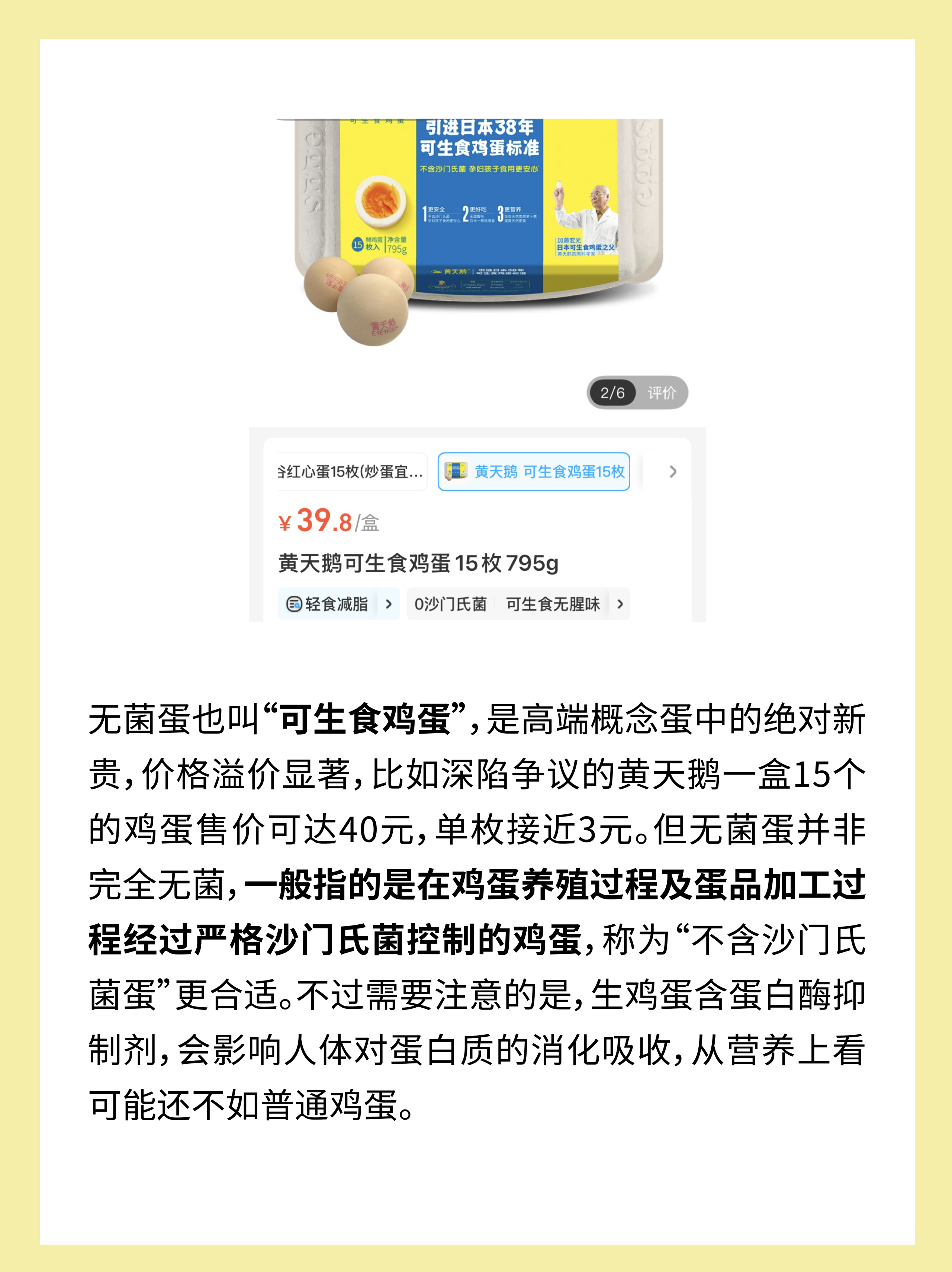 无菌蛋也叫可生食鸡蛋,是高端概念蛋中的绝对新贵,价格溢价显著,比如深陷争议的黄天鹅一盒15个的鸡蛋售价可达40元,单枚接近3元。但无菌蛋并非完全无菌,一般指的是在鸡蛋养殖过程及蛋品加工过程经过严格沙门氏菌控制的鸡蛋,称为“不含沙门氏菌蛋”更合适。不过需要注意的是,生鸡蛋含蛋白酶抑制剂,会影响人体对蛋白质的消化吸收,从营养上看可能还不如普通鸡蛋。