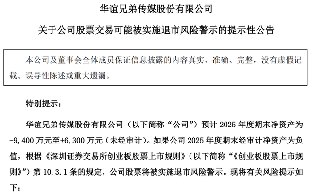 更让市场紧张的是净资产状况。公告显示,经初步测算,公司2025年期末净资产为-9400万元至+6300万元(未经审计),几乎就在“正负之间”徘徊。如果最终审计结果落入负值区间,根据《深圳证券交易所创业板股票上市规则》,公司股票将被实施退市风险警示。换句话说,华谊兄弟如今已经站在退市悬崖边缘。