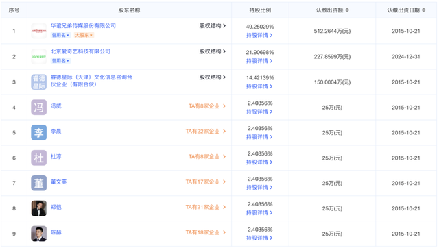 公开资料显示,浩瀚娱乐成立于2015年10月,注册资本约1040万元,法定代表人为华谊系高管刘韬。公司的股东结构呈现出明显的“资本+艺人”模式:除华谊控股外,爱奇艺关联公司持股21.9%,此外,六位明星股东——李晨、Angelababy(杨颖)、冯绍峰(冯威)、陈赫、郑恺、杜淳各持有浩瀚娱乐约2.4%的股权,并且都是公司成立时的原始股东。