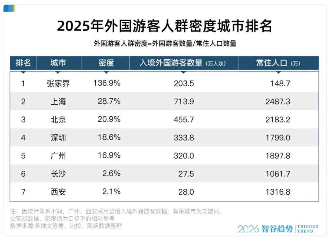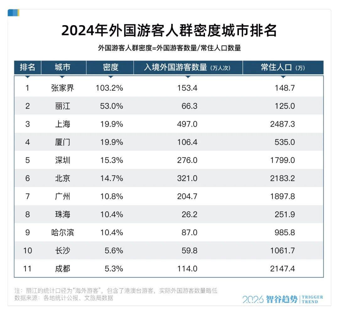 智谷趋势梳理了2024、2025年中国内地所有公布“入境外国游客数量”的城市数据,勾勒背后大趋势。结合一座城市的常住人口,一个关键指标浮出水面: