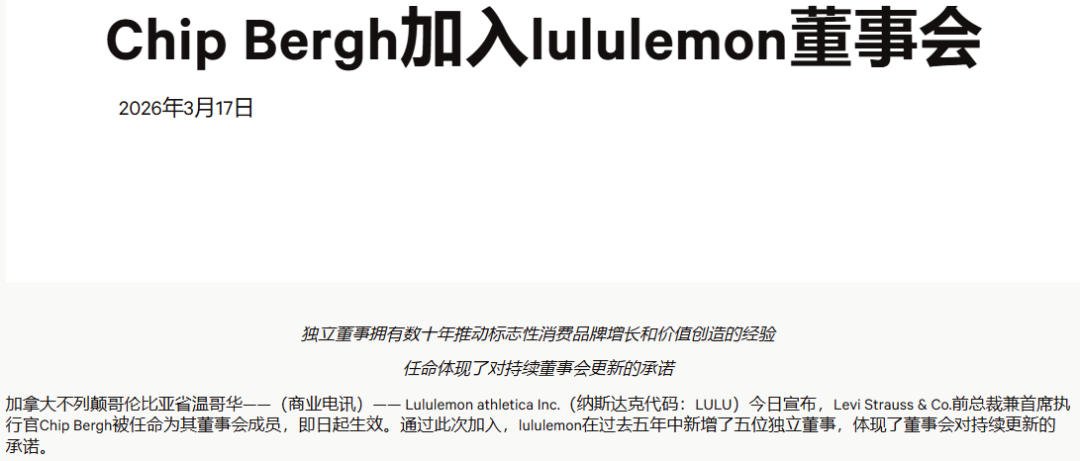 就在发布业绩的这一天,Lululemon同时公布了董事会新人选。