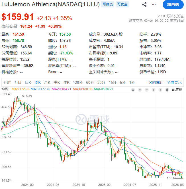 确实,lululemon 股价走势堪忧,从2024年开始进入下跌趋势。