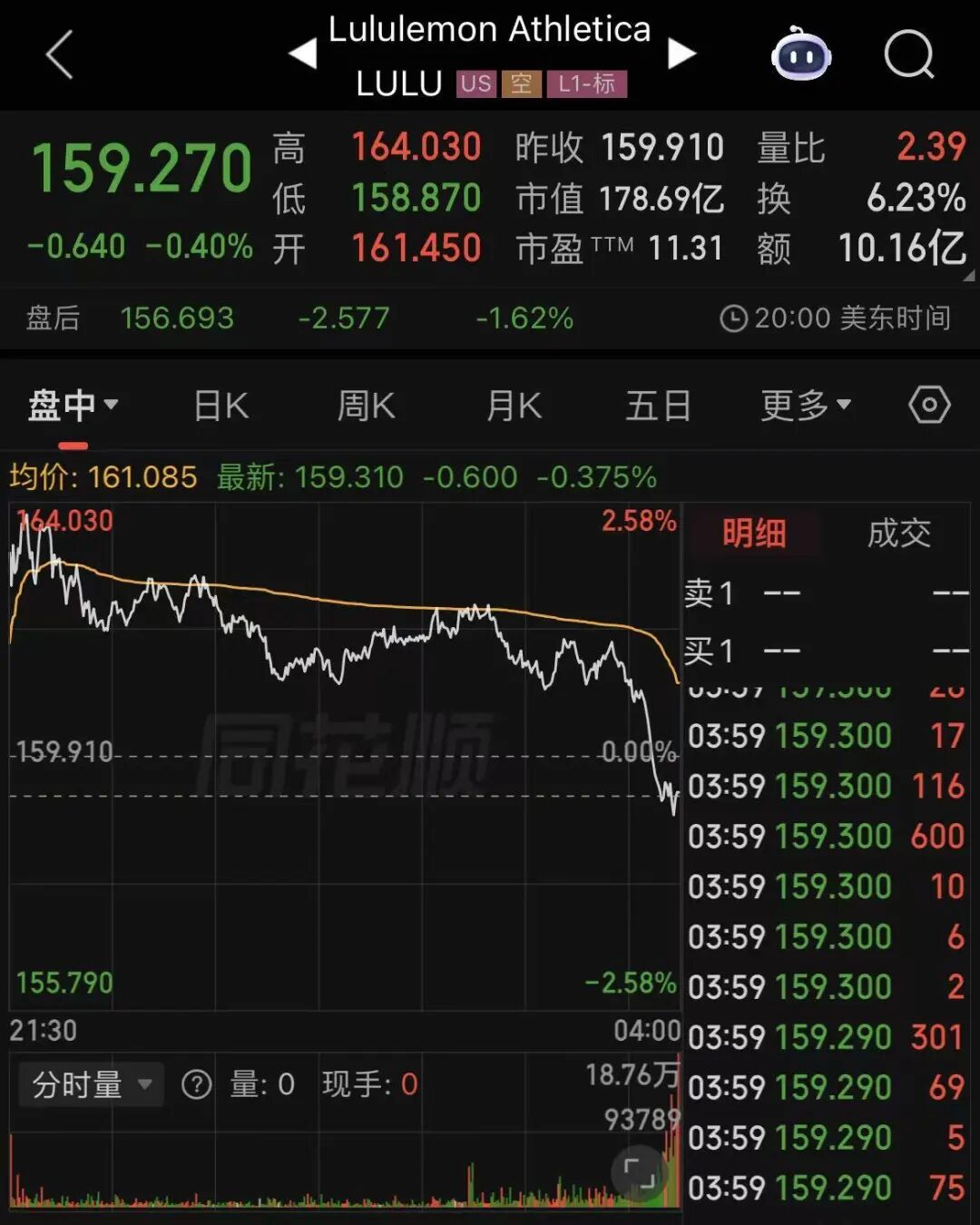 业绩公布前的当天股价走势,Lululemon尾盘仍然下挫。