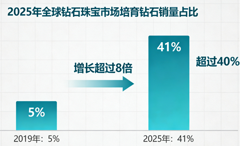 宏观数据印证了这一趋势。央视报道显示,2025年,在全球钻石珠宝市场中,培育钻石的销量占比已超过40%,较2019年增长了超过8倍。