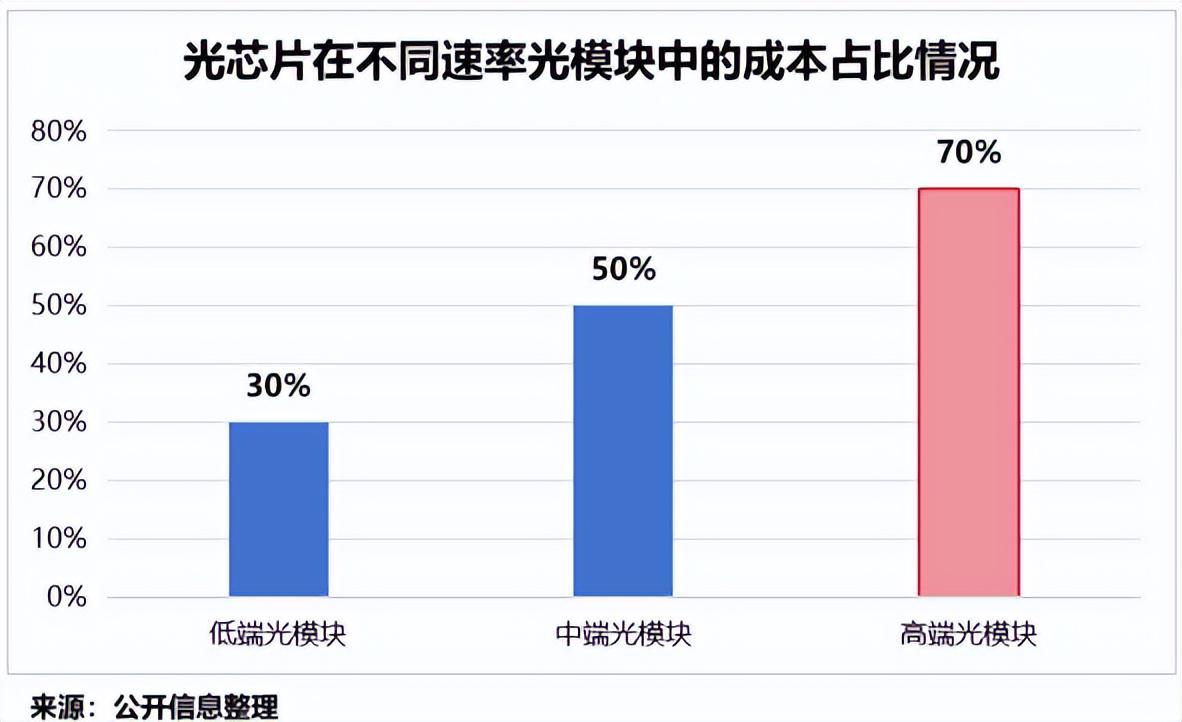 从成本构成来看,在低端光模块中,光芯片的成本占比仅为30%;而在高速光模块中,这一比例可提升至70%。