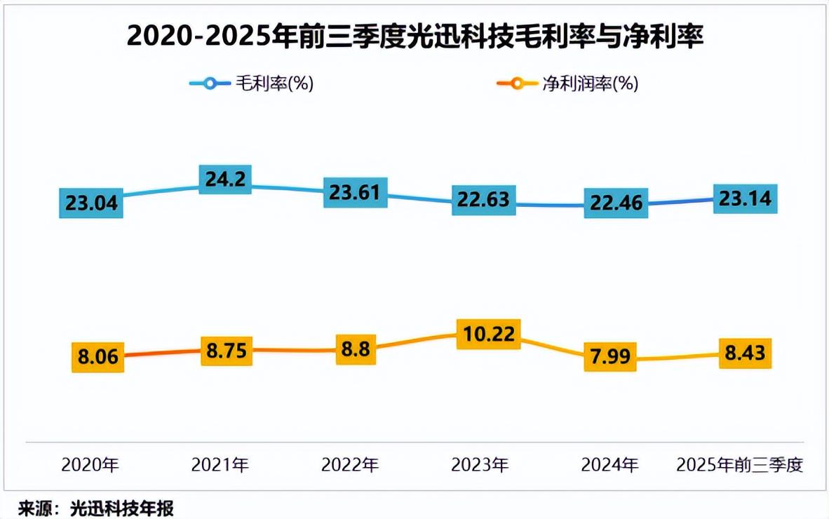 先看数据,2020-2025年前三季度,光迅科技的毛利率一直稳定在23%左右,说明产品本身的盈利能力并不差;但净利润率却始终在8%-10%之间徘徊。