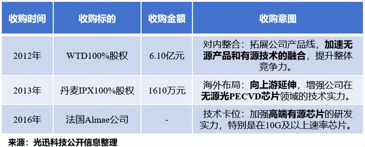 2012年,光迅科技以6.1亿元收购控股股东旗下全资子公司WTD 100%的股权,拓展公司产品线,实现无源光器件与有源光器件的互补。