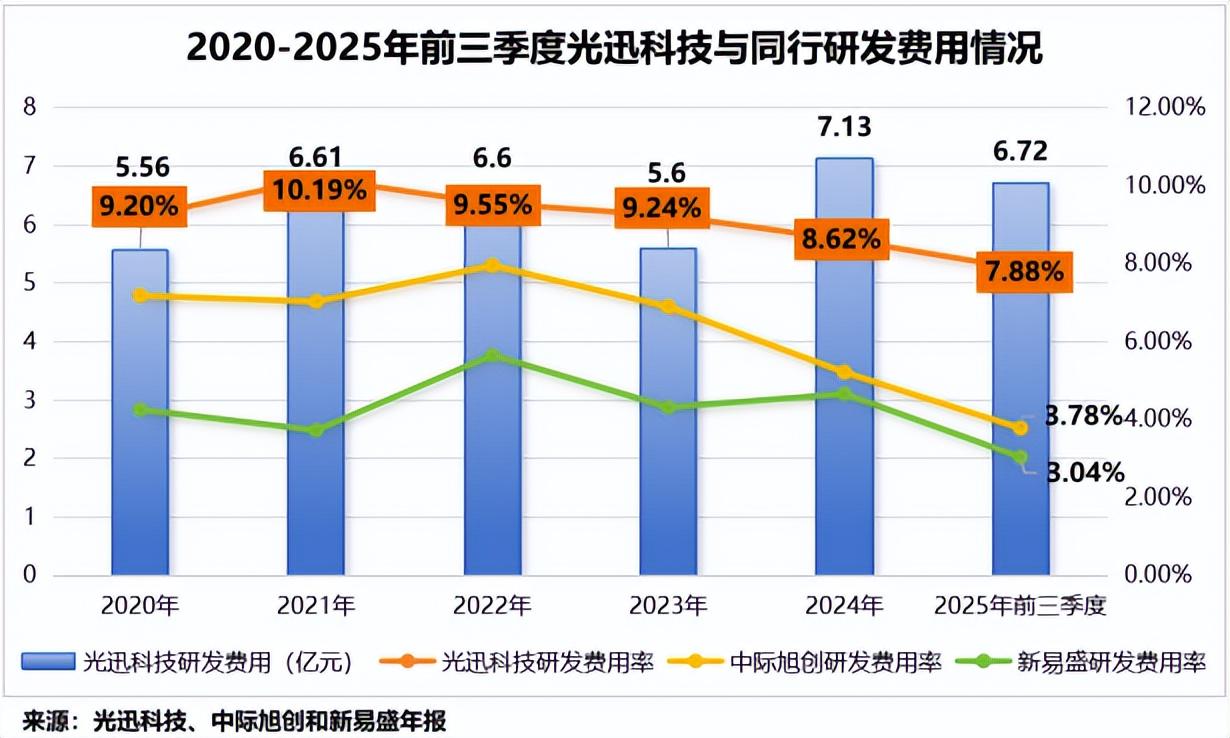 2020-2025年前三季度,公司累计投入研发费用高达38.22亿元,研发费用率也维持在7%以上,远高于中际旭创、新易盛等同行。