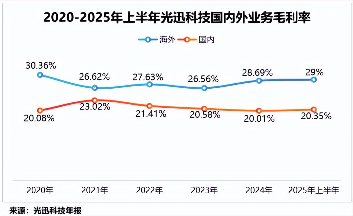 以2025年上半年为例,公司海外毛利率为29%,国内毛利率仅为20.35%,相差近9个百分点。