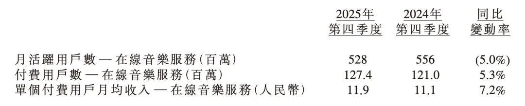 随着2025年业绩披露完毕,站在新财年的起点,腾讯音乐宣布,将停止披露若干季度经营指标,包括在线音乐月活跃用户数、付费用户数及单个付费用户月均收入,改为每年披露一次年末音乐服务付费用户总数。