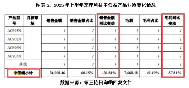 杰理科技在第三轮问询函回复文件中坦言,公司产品矩阵虽覆盖高中低端市场,但报告期内仍以非品牌、对客单价敏感度高的中低端市场为主。2025年上半年,杰理科技中低端蓝牙耳机芯片销售额同比下滑36.84%,毛利同比下滑57.81%,成为拖累蓝牙耳机芯片业务整体下滑的核心因素,也印证了其过度依赖中低端市场的发展短板。
