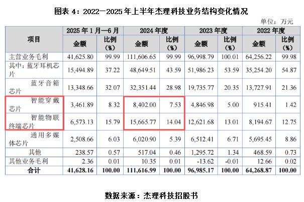 业绩下滑的背后,是杰理科技在高端市场拓展的举步维艰。招股书显示,2024年,杰理科技的智能穿戴芯片收入为8402万元,不足1亿元,营收占比仅为7.53%;智能物联终端芯片收入为1.57亿元,营收占比为14.04%,两大与高端赛道相关的业务收入占比均处于较低水平。即便到了2025年上半年,上述两个产品业务收入占比分别小幅提升至8.32%、15.79%,但仍未实现实质性突破,向高端突围的成效甚微。
