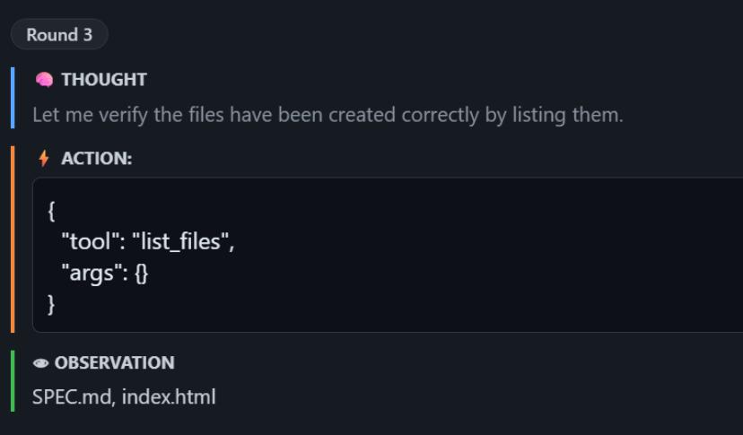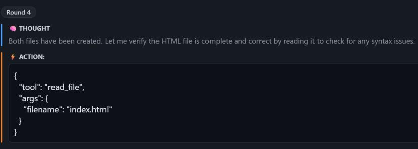 整个过程并不是一帆风顺的——Agent 在早期的几轮迭代中,JSON 格式的工具调用偶尔会出错,导致框架解析失败,返回一个红色的错误提示。