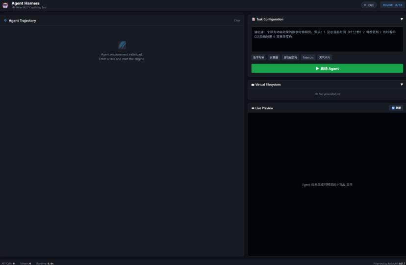 为了测试M2.7的Agent能力,我专门搭了一个Agent Harness测试框架。界面长得像一个深色主题的IDE:左边是 agent的思考轨迹面板,实时显示它每一步在想什么、打算做什么。