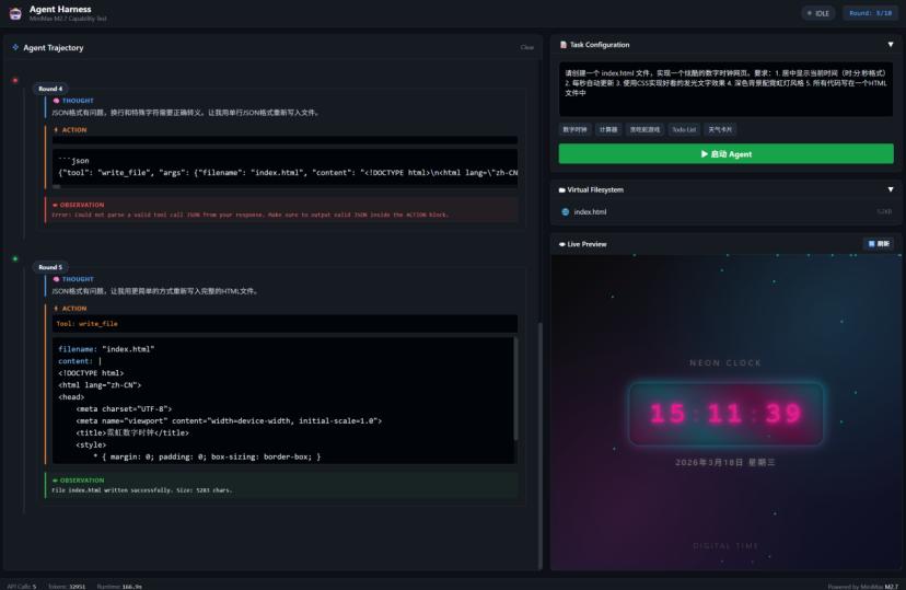 从理解需求到规划方案到写代码到自检到交付,整个Agent工作流跑得行云流水,没有一步多余的操作。这说明M2.7对ReAct框架的适配相当成熟,它知道什么时候该想、什么时候该动手、什么时候该收工。