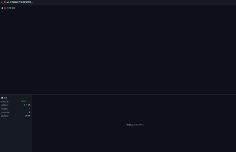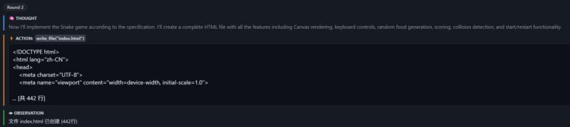第2轮,进入正题。M2.7会创建一个完整的HTML文件,包含所有功能,包括画布渲染、键盘控制、随机食物生成、计分、碰撞检测以及开始 / 重新开始功能。