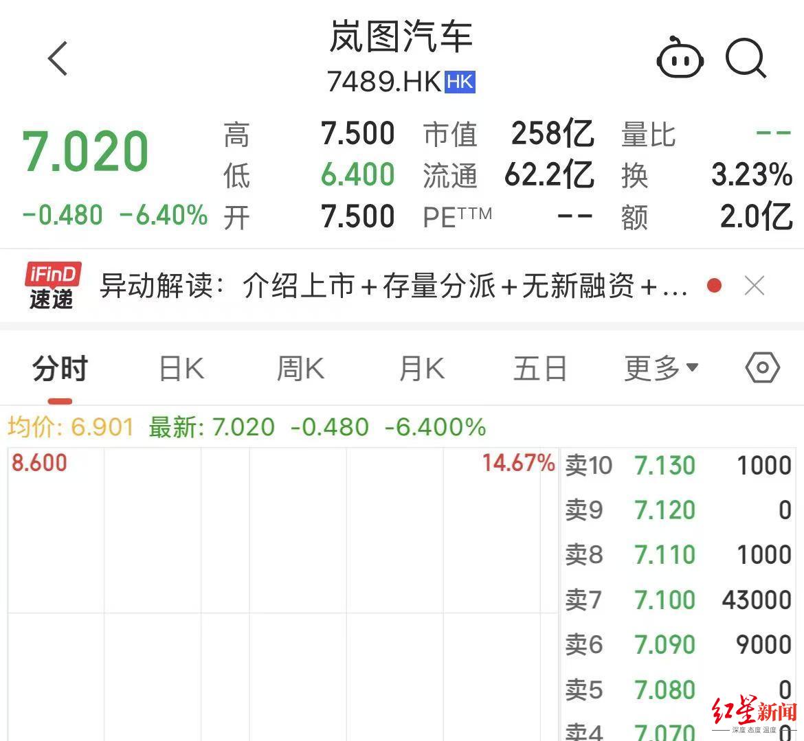 红星资本局3月19日消息,今日,岚图汽车(07489.HK)在香港联交所主板正式挂牌上市。上市首日,岚图汽车开盘破发,盘中报6.51港元每股,一度跌超13%。截至午间收盘,股价跌8%,报6.9港元/股,市值254亿港元。