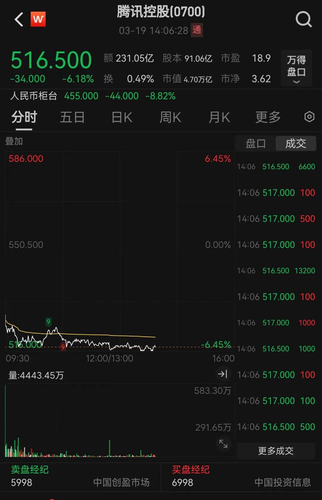 3月19日,披露2025年业绩后的腾讯控股(00700.HK),早盘一度大跌超过6%,中午收盘跌5.9%,报收518港元,成交191亿港元,总市值跌破5万亿港元。午后该股继续大跌,截至发稿,跌6.18%,报516.5港元。