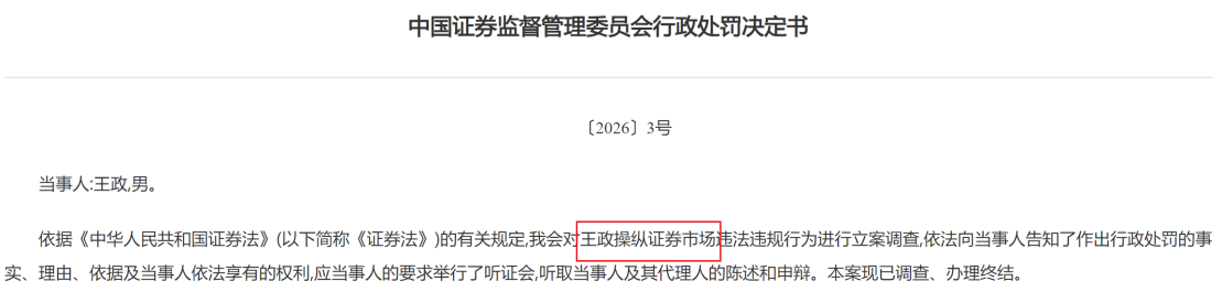 值得一提的是,证监会〔2026〕1号《行政处罚决定书》也指向操纵市场。