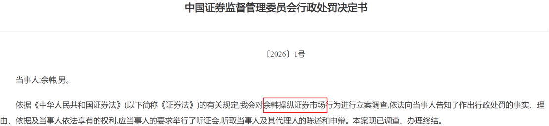 值得注意的是,证监会〔2026〕1号罚单也开给了操纵证券市场的当事人,余韩被“没一罚一”罚没10.22亿元,并被采取“证券市场禁入+证券市场禁止交易”的“双重禁入”措施。