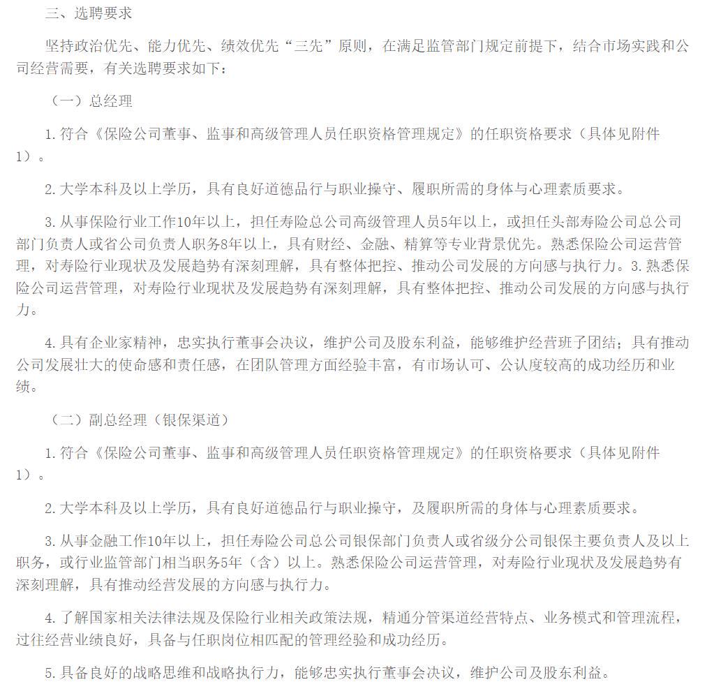 此次公开选聘门槛严苛,精准匹配公司业绩提升与渠道优化需求。总经理需具备10年以上保险行业从业经验,其中寿险总公司高级管理人员任职5年以上,或头部寿险总公司部门负责人、省公司负责人任职8年以上,财经、金融、精算等专业背景优先,同时需具备较强的战略把控力和团队管理能力,拥有市场认可的经营业绩。副总经理(银保渠道)则要求10年以上金融工作经验,5年以上相关管理岗位任职经历,精通银保渠道经营模式,过往业绩良好,这与公司高度依赖银保渠道的业务现状高度契合。