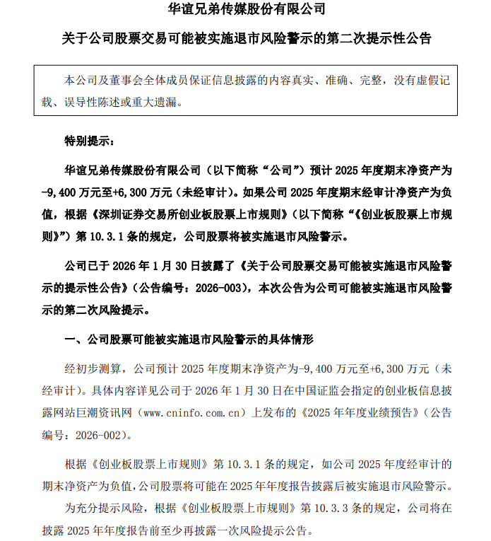 更令人担忧的是净资产的变化。3月13日,华谊兄弟发布公告,公司预计2025年度期末净资产为-9,400万元至+6,300万元(未经审计)。若经审计的2025年度期末净资产为负值,根据《深圳证券交易所创业板股票上市规则》第10.3.1条的规定,公司股票将在2025年年度报告披露后被实施退市风险警示。公司2025年年度报告预计于2026年4月29日披露,最终财务数据以正式披露的经审计报告为准。若年报确认期末净资产为负,公司将于年报披露当日同步披露股票交易将被实施退市风险警示的公告,股票于公告后停牌一天,复牌之日起实施退市风险警示。