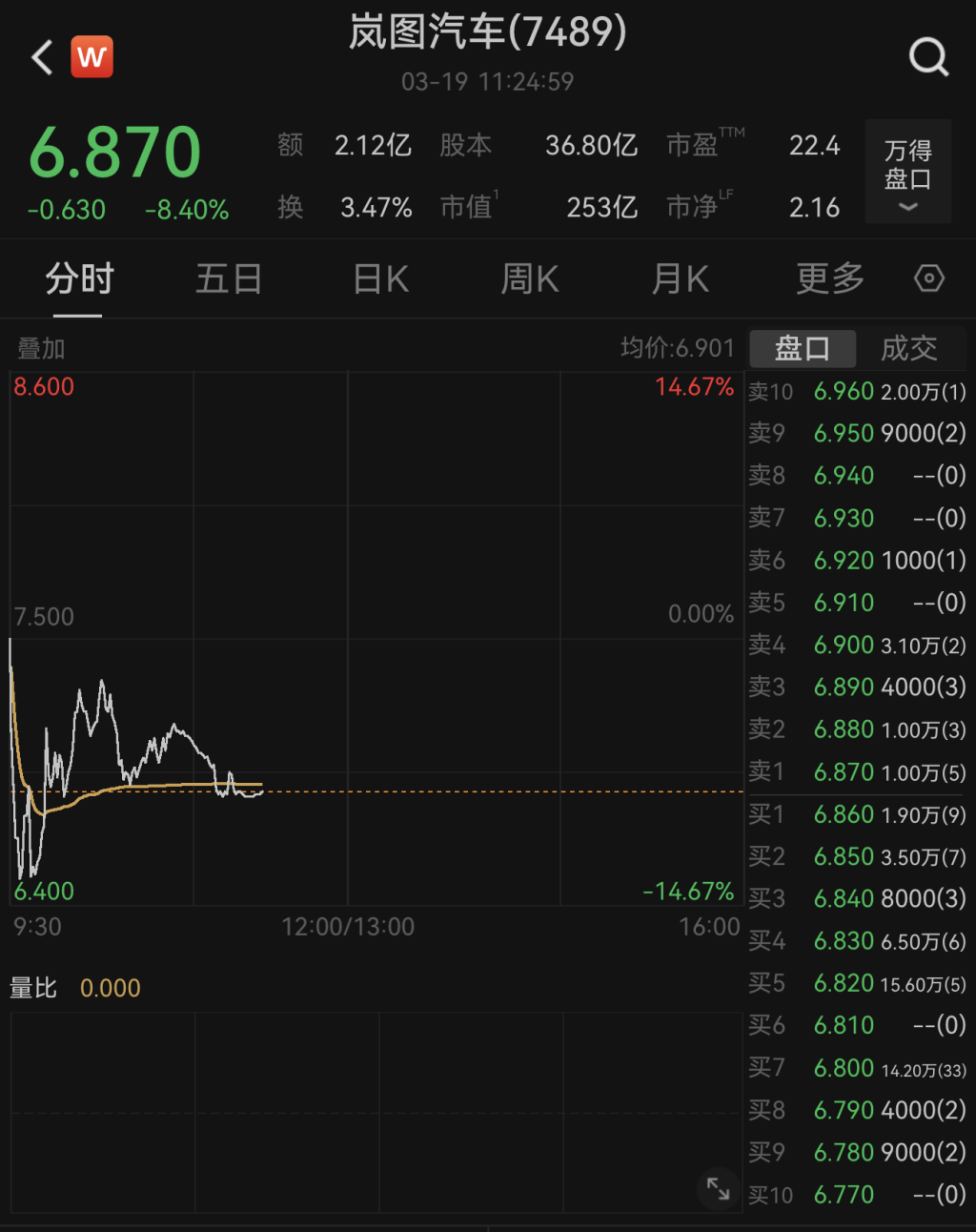 截至3月19日收盘,岚图汽车跌13.2%,市值240亿港元。
