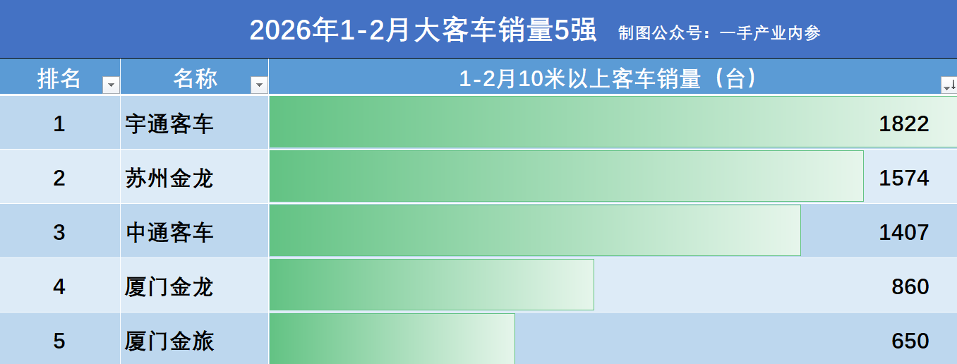 另附:2026年1-2月中国10米以上大客车销量TOP 5厂商名单,数据源于:中国客车网。
