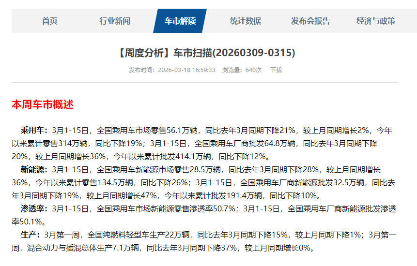 乘联分会公布数据显示,3月1-15日,全国乘用车市场零售56.1万辆,同比去年3月同期下降21%,较上月同期增长2%,今年以来累计零售314万辆,同比下降19%;3月1-15日,全国乘用车厂商批发64.8万辆,同比去年3月同期下降20%,较上月同期增长36%,今年以来累计批发414.1万辆,同比下降12%。