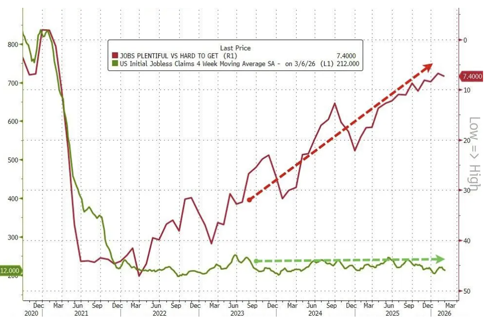 美国上周首次申请失业救济人数降至1月以来最低水平,进一步强化了“裁员仍然有限”的信号,为市场判断美国劳动力市场韧性提供了最新依据。