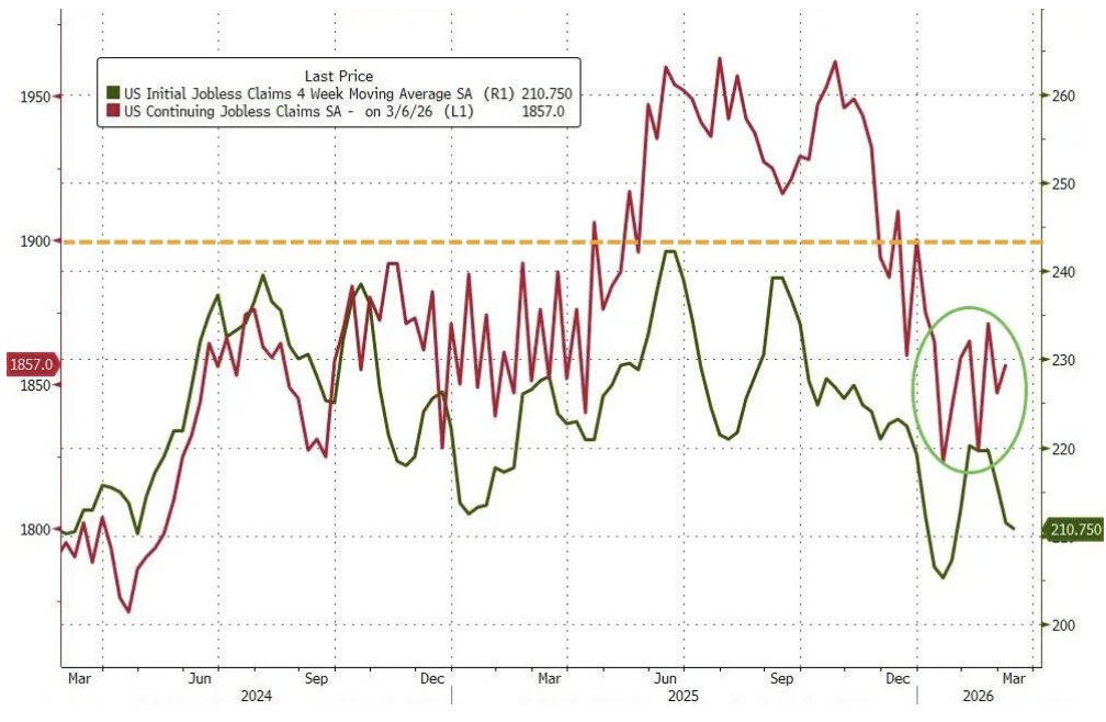 彭博对经济学家的调查预期中值为215,000人,实际数据低于预期,意味着新增申领规模短期内未显著抬升。