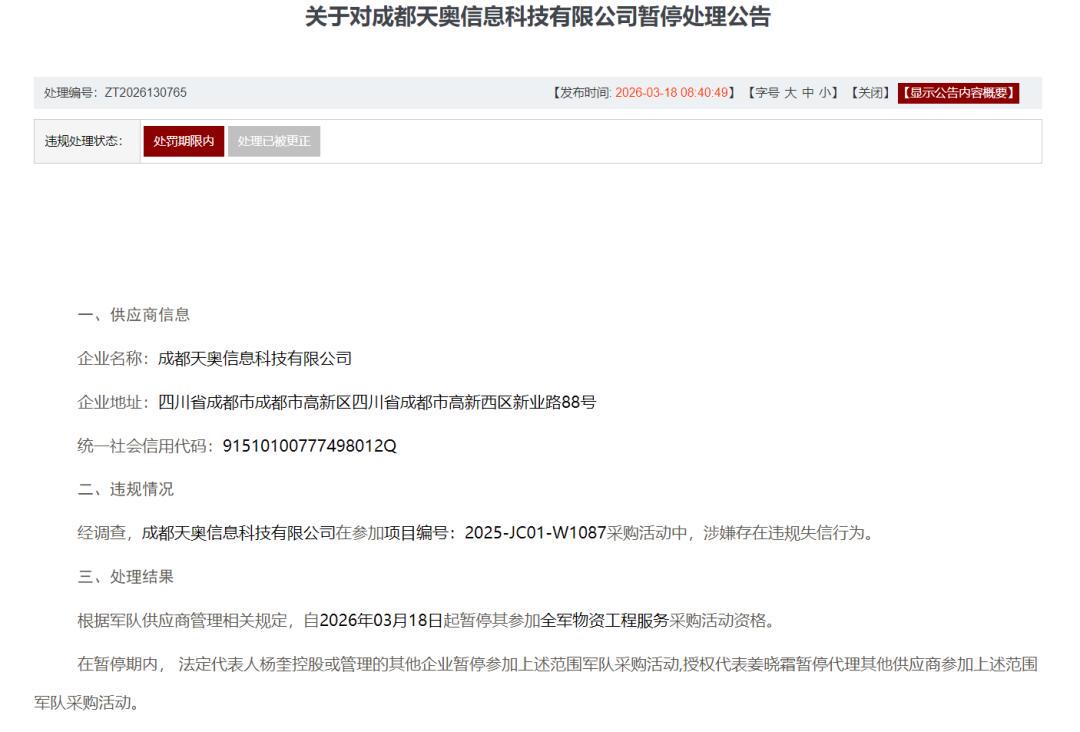 3月18日,军队采购网发布公告,明确成都天奥信息科技有限公司因在投标中提供虚假材料,被暂停参加全军物资工程服务采购活动资格,处罚自当日起正式生效。此次处罚不仅直指企业违规行为,更对其法定代表人、授权代表关联主体实施连带限制,彰显了军队采购领域对失信行为的零容忍态度,也为相关企业敲响了合规经营的警钟。