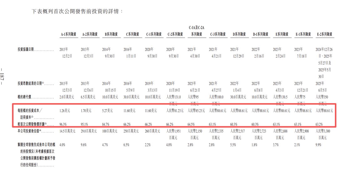 以高瓴资本为例,其分别在B轮、C2轮和E1轮进行了投资,按成本计算,高瓴资本的成本至少较发行价折让63%,折价区间介乎63%-85%之间。