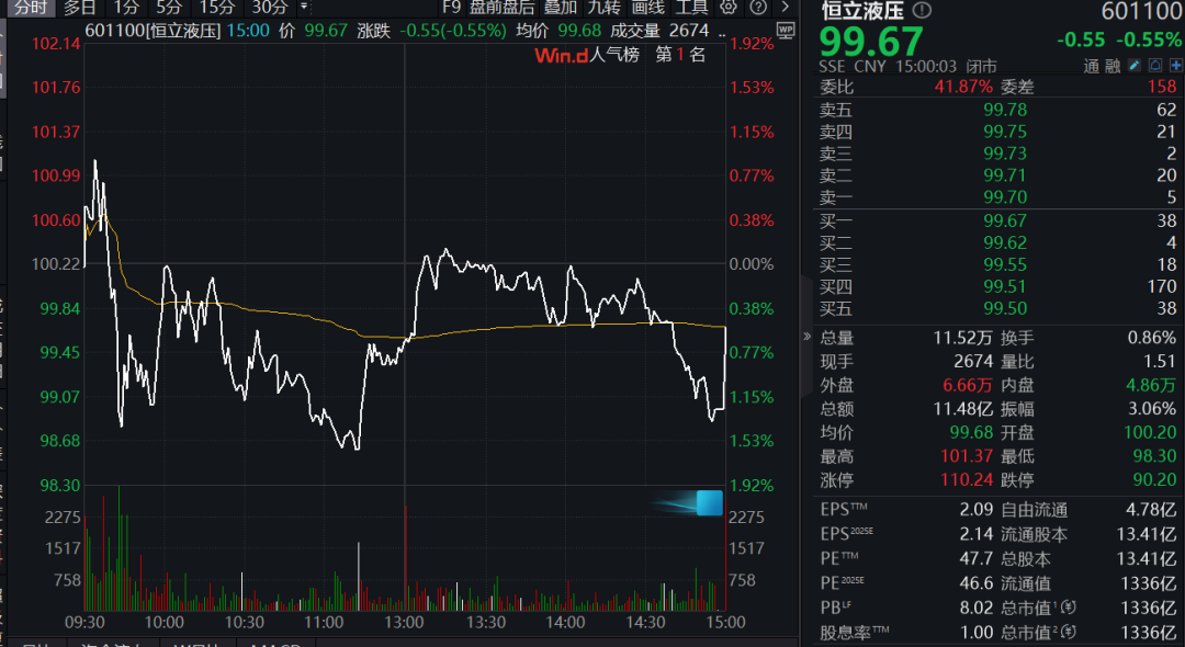 截至今日收盘,恒立液压股价报99.67元,总市值为1336亿元。