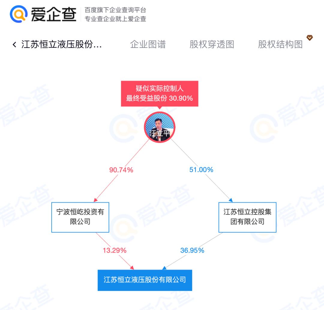 股东信息显示,该公司由江苏恒立控股集团有限公司、宁波恒屹投资有限公司等共同持股。其中,汪立平通过江苏恒立控股集团有限公司、宁波恒屹投资有限公司间接控股该公司,为该公司的最终受益人,最终受益股份30.9%。