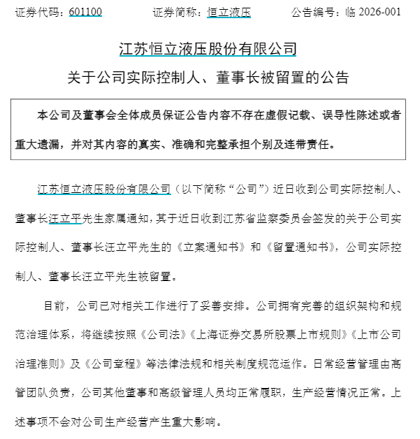 3月20日,恒立液压(601100)发布公告,公司实际控制人、董事长汪立平被留置。