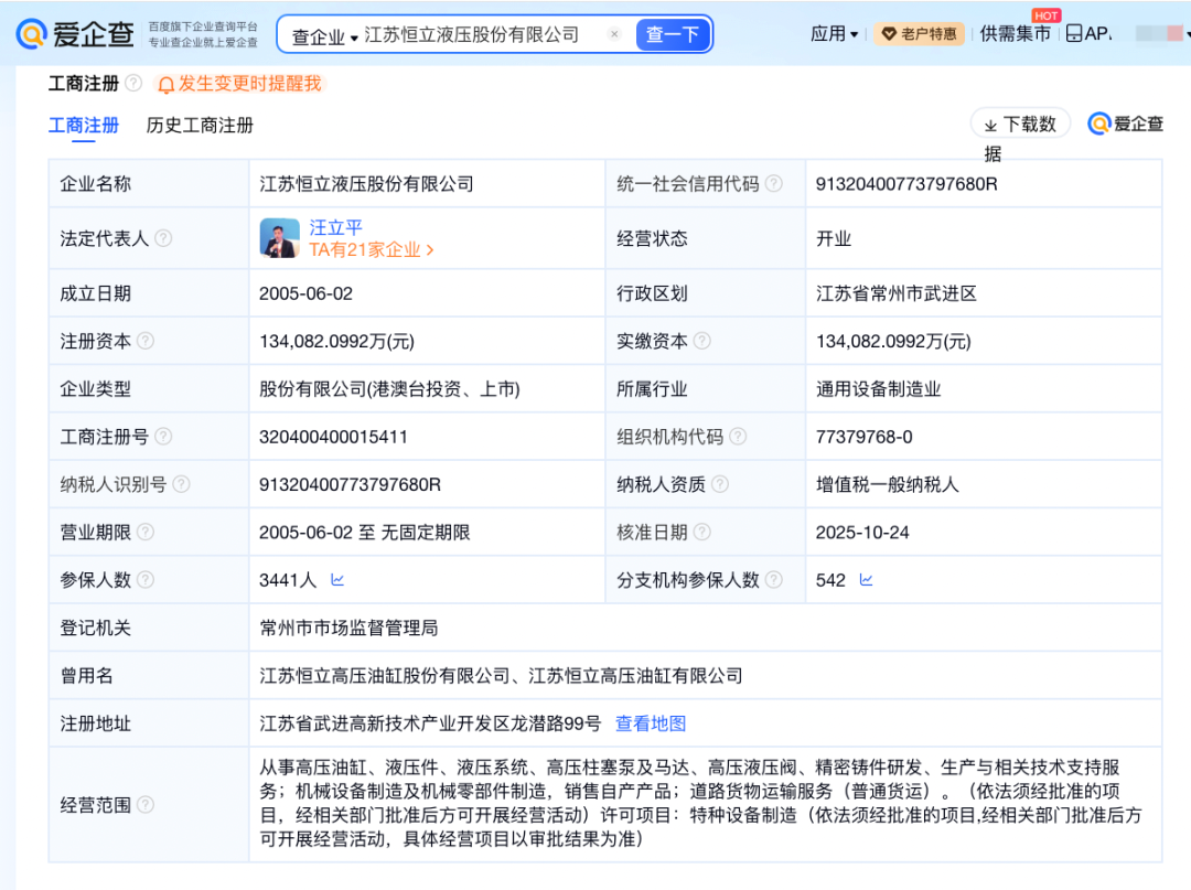 爱企查App显示,江苏恒立液压股份有限公司成立于2005年6月,董事长、法定代表人为汪立平,注册资本约13.4亿元人民币。