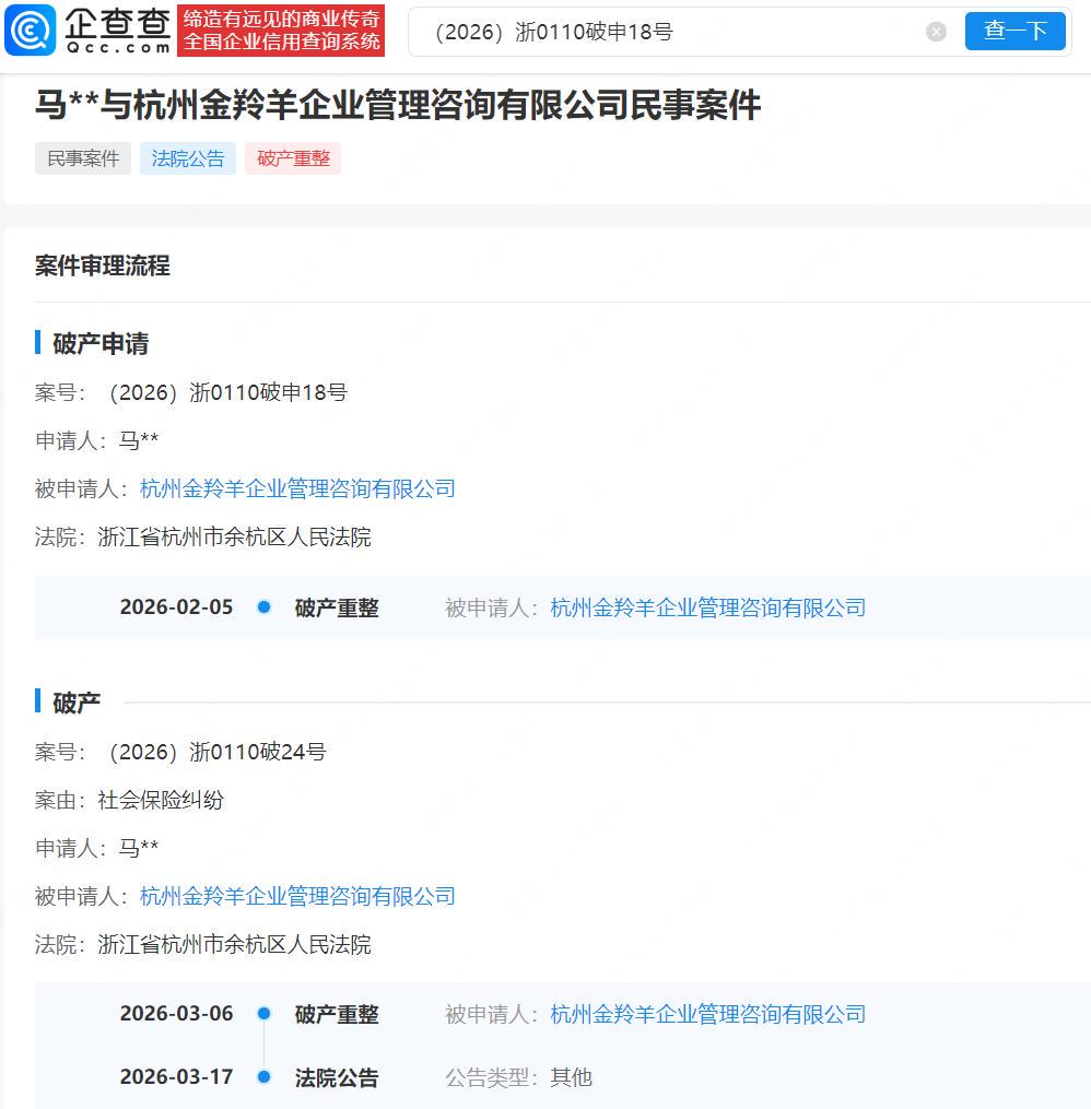 杭州金羚羊成立于2018年5月,注册资本1.5亿元,法定代表人为蔡红亮,经营范围涵盖企业管理咨询、餐饮企业管理、食品经营等,由上海羚财企业管理咨询合伙企业及蔡红亮等共同持股,是自嗨锅品牌的核心运营主体。据法院公告,杭州市余杭区人民法院已于2026年3月6日裁定受理该公司破产清算一案,并指定律师事务所担任管理人,要求债权人于5月7日前申报债权,5月14日将召开第一次债权人会议。