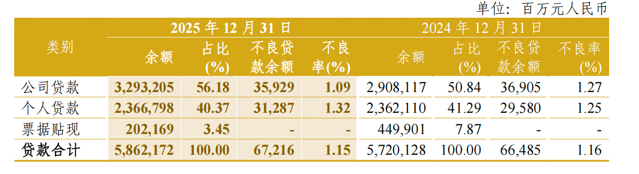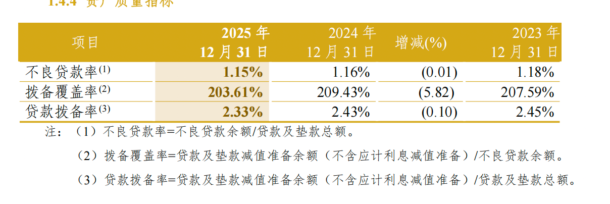 资产质量方面,截至2025年末,中信银行不良贷款余额672.16亿元,比上年末增加7.31亿元,增长1.10%;不良贷款率1.15%,比上年末下降0.01个百分点;拨备覆盖率203.61%,比上年末下降5.82个百分点。