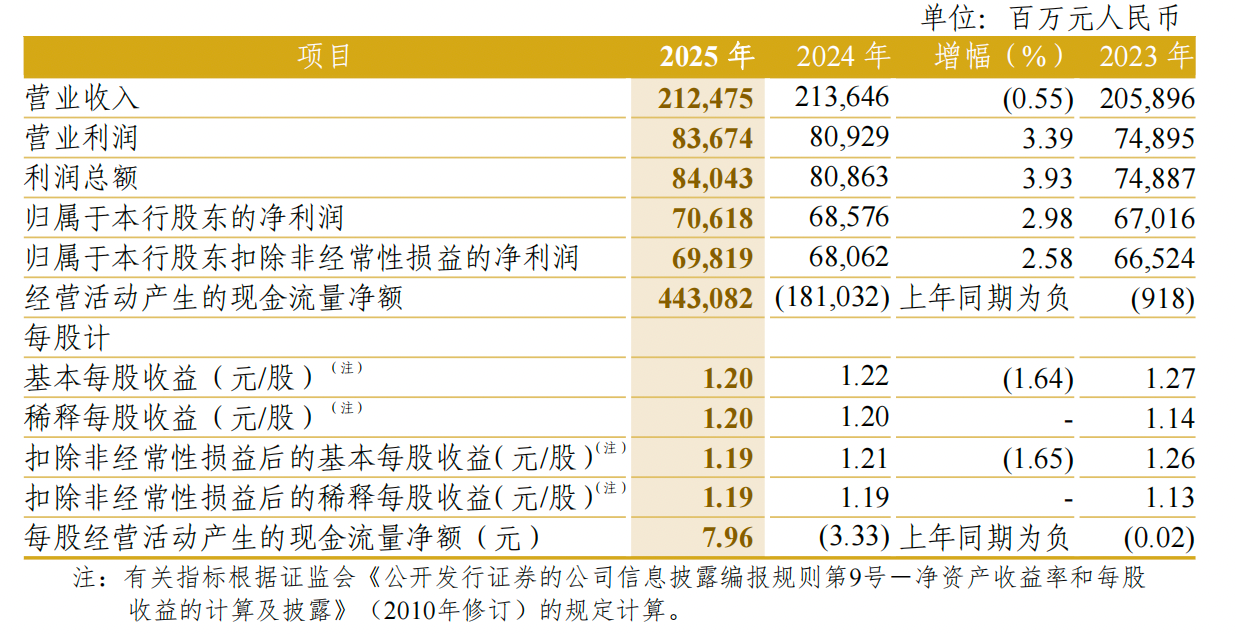 中信银行还同步披露了2025年度利润分配方案:拟每10股派发现金股息1.93元人民币(含税),总额为107.40亿元,连同已派发的中期现金股息104.61亿元(每10股派发现金股息1.88元人民币),全年派发现金股息合计212.01亿元,占2025年度合并后归属于该行普通股股东净利润的31.75%,占合并后归属于该行股东净利润的30.02%。