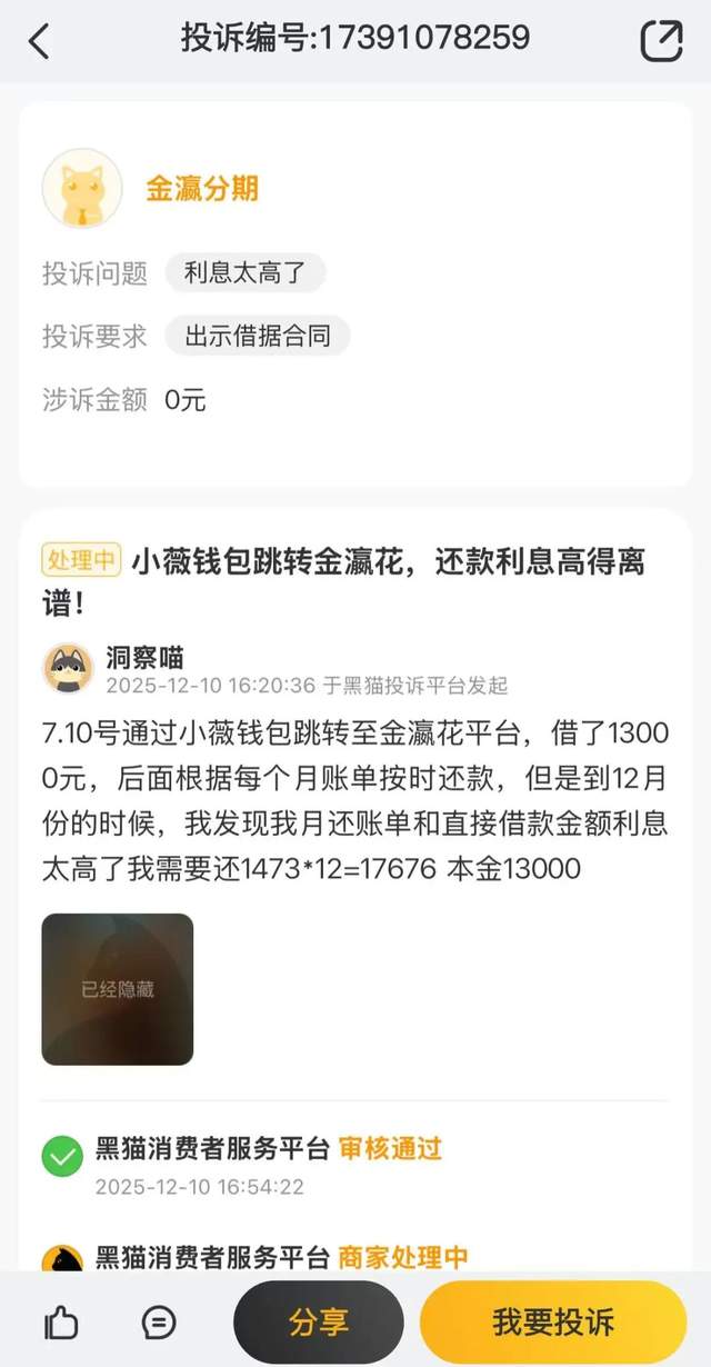 薇钱包的喜享购正是这种模式的典型代表。一位消费者在黑猫平台投诉显示,在薇钱包里的喜享购借款5000元,到手3500元,实际上该笔借款1500元的“砍头息”,年化利率同样超过24%。这种到账金额与申请金额不符的情况,疑似存在变相扣除费用的嫌疑,进一步加重了借款人的融资负担。