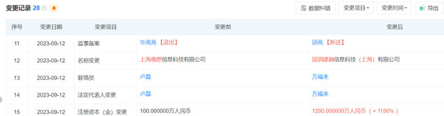 此前,国润建融名称为上海桷懋信息科技有限公司,注册资本仅为100万元,2023年9月该公司股东和名称全部变更,注册与实缴资本增至1200万元,股东为上海六途科技有限公司、上海英盾保安服务有限公司,持股比例分别为80%、20%。国润建融2024年11月申请了“薇钱包”商标。