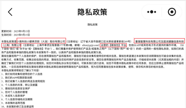 在薇钱包的隐私政策协议中提示,薇钱包由小薇科技小额再贷款(大连)股份有限公司(下称“小薇再贷”)、蔷薇智慧科技有限公司(下称“蔷薇智科”)、国润建融信息科技(上海)有限公司(下称“国润建融”)共同运营,并将三家主体简称为“我们”或“本平台”或“薇钱包”平台。
