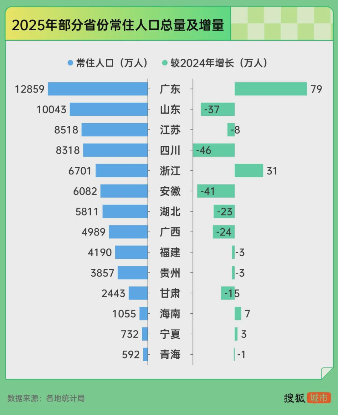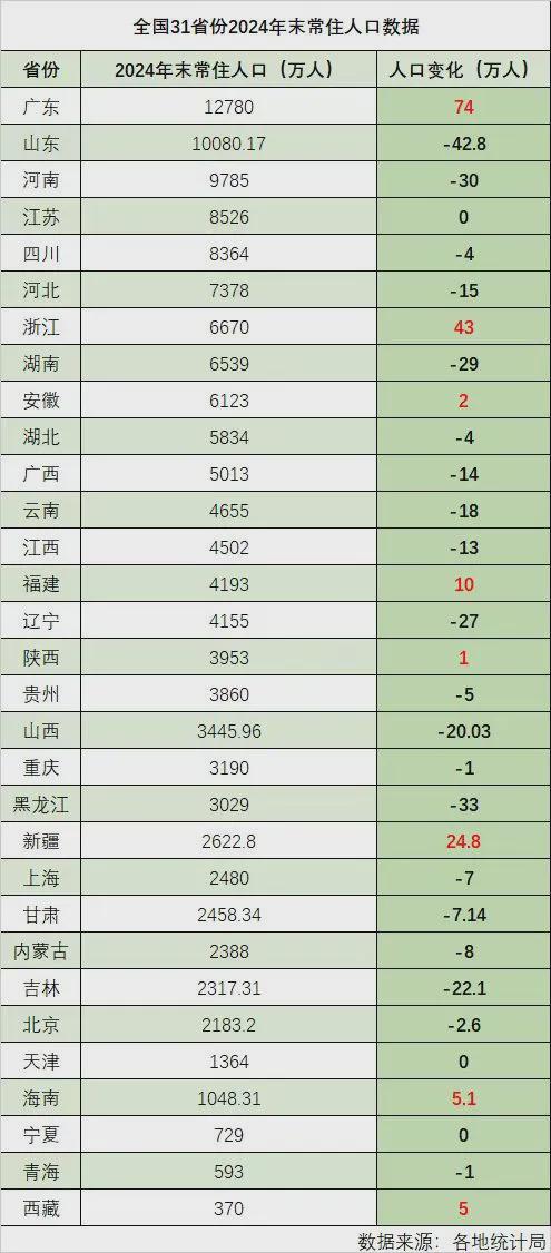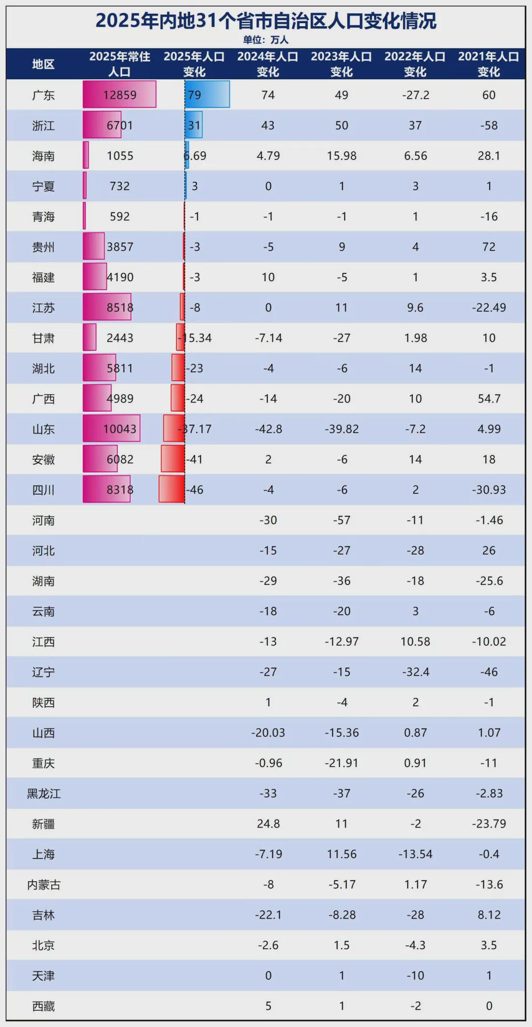 到2025年,常住人口过亿的省份仍有两个,但山东在连续减少后只有10043万人,不排除未来两年内跌出“亿级人口省份”行列。