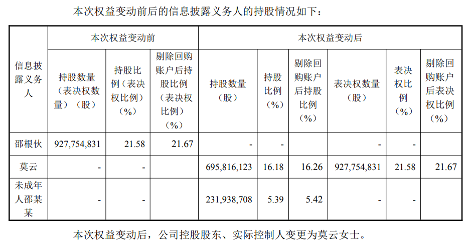 根据北京市精诚公证处出具的《公证书》,邵根伙生前未订立遗嘱,亦未与他人签订遗赠扶养协议,邵根伙生前持有的公司股份中的一半(即4.64亿股大北农股票)为其遗产,由其配偶莫云、未成年女儿邵某某共同继承。基于夫妻共同财产分割及遗产继承,莫云继承6.96亿股股票,占公司总股本的16.18%;未成年女儿邵某某继承2.32亿股股票,占公司总股本的5.39%。